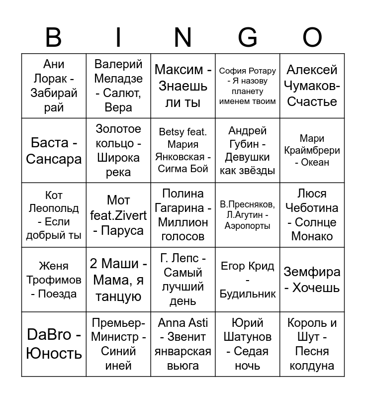 This bingo card has 25 words: 2 Маши - Мама, я танцую, Anna Asti - Звенит январская вьюга, Betsy feat. Мария Янковская - Сигма Бой, DaBro - Юность, Алексей Чумаков- Счастье, Ани Лорак - Забирай рай, Баста - Сансара, Валерий Меладзе - Салют, Вера, В.Пресняков, Л.Агутин - Аэропорты, Г. Лепс - Самый лучший день, Андрей Губин - Девушки как звёзды, Кот Леопольд - Если добрый ты, Егор Крид - Будильник, Земфира - Хочешь, Золотое кольцо - Широка река, Король и Шут - Песня колдуна, Люся Чеботина - Солнце Монако, Максим - Знаешь ли ты, Мари Краймбрери - Океан, Мот feat.Zivert - Паруса, Полина Гагарина - Миллион голосов, Премьер-Министр - Синий иней, Женя Трофимов - Поезда, София Ротару - Я назову планету именем твоим and Юрий Шатунов - Седая ночь.
