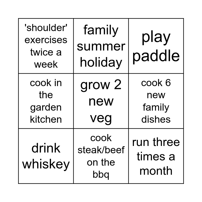 This bingo card has a free space and 8 words: cook 6 new family dishes, play paddle, family summer holiday, drink whiskey, 'shoulder' exercises twice a week, run three times a month, cook in the garden kitchen and cook steak/beef on the bbq.