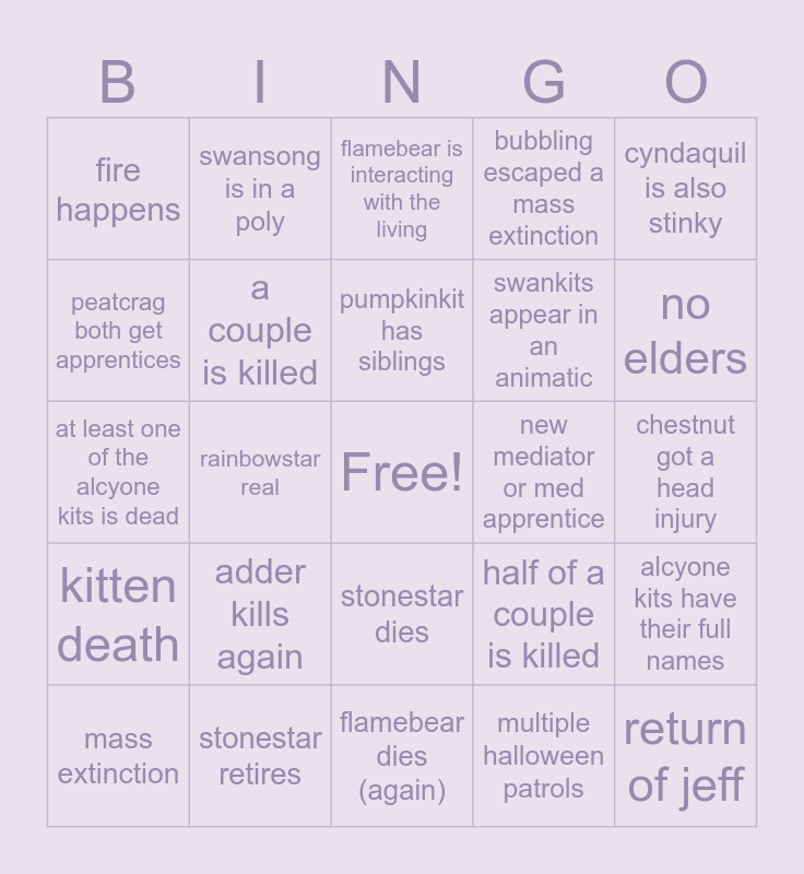 This bingo card has a free space and 24 words: mass extinction, adder kills again, pumpkinkit has siblings, multiple halloween patrols, cyndaquil is also stinky, fire happens, swansong is in a poly, flamebear is interacting with the living, new mediator or med apprentice, chestnut got a head injury, at least one of the alcyone kits is dead, a couple is killed, half of a couple is killed, alcyone kits have their full names, peatcrag both get apprentices, stonestar retires, flamebear dies (again), bubbling escaped a mass extinction, no elders, kitten death, rainbowstar real, stonestar dies, swankits appear in an animatic and return of jeff.