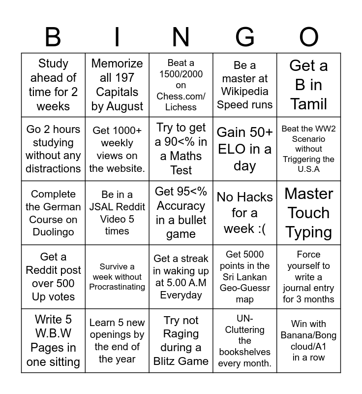 This bingo card has a free space and 24 words: Survive a week without Procrastinating, Learn 5 new openings by the end of the year, Try to get a 90<% in a Maths Test, Write 5 W.B.W Pages in one sitting, Get a B in Tamil, Study ahead of time for 2 weeks, Go 2 hours studying without any distractions, Memorize all 197 Capitals by August, No Hacks for a week :(, Get a streak in waking up at 5.00 A.M Everyday, Gain 50+ ELO in a day, Complete the German Course on Duolingo, Get 5000 points in the Sri Lankan Geo-Guessr map, Force yourself to write a journal entry for 3 months, Get 1000+ weekly views on the website., UN-Cluttering the bookshelves every month., Master Touch Typing, Beat a 1500/2000 on Chess.com/ Lichess, Beat the WW2 Scenario without Triggering the U.S.A, Be in a JSAL Reddit Video 5 times, Win with Banana/Bong cloud/A1 in a row, Get a Reddit post over 500 Up votes, Be a master at Wikipedia Speed runs and Try not Raging during a Blitz Game.