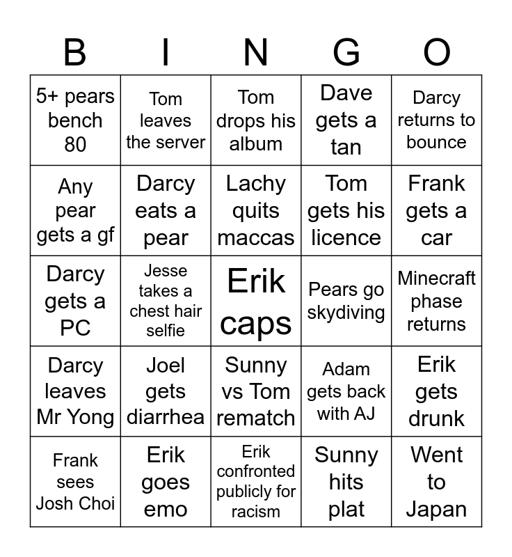 This bingo card has a free space and 24 words: Joel gets diarrhea, Erik goes emo, Lachy quits maccas, Frank sees Josh Choi, Darcy returns to bounce, 5+ pears bench 80, Any pear gets a gf, Tom leaves the server, Pears go skydiving, Sunny vs Tom rematch, Tom gets his licence, Darcy gets a PC, Adam gets back with AJ, Erik gets drunk, Darcy eats a pear, Sunny hits plat, Minecraft phase returns, Tom drops his album, Frank gets a car, Jesse takes a chest hair selfie, Went to Japan, Darcy leaves Mr Yong, Dave gets a tan and Erik confronted publicly for racism.