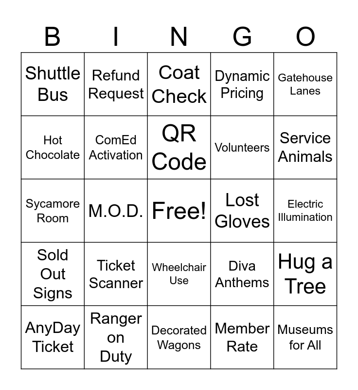 This bingo card has a free space and 24 words: Ticket Scanner, Ranger on Duty, QR Code, AnyDay Ticket, Gatehouse Lanes, Shuttle Bus, Hot Chocolate, Refund Request, Lost Gloves, Wheelchair Use, Volunteers, Sycamore Room, Diva Anthems, Hug a Tree, ComEd Activation, Member Rate, Electric Illumination, Coat Check, Service Animals, M.O.D., Museums for All, Sold Out Signs, Dynamic Pricing and Decorated Wagons.
