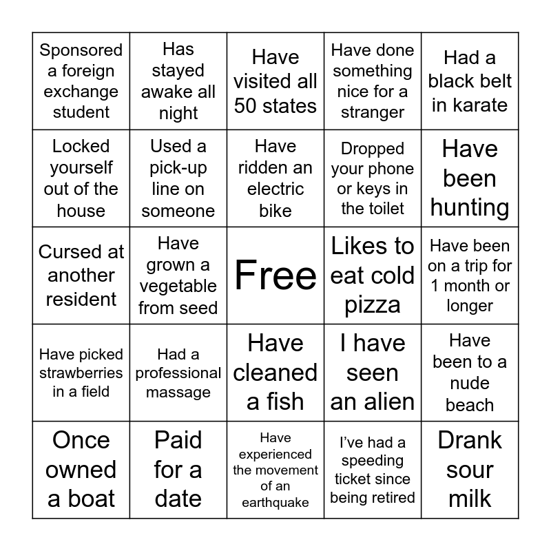 This bingo card has a free space and 24 words: Had a professional massage, Paid for a date, Have ridden an electric bike, Once owned a boat, Had a black belt in karate, Sponsored a foreign exchange student, Locked yourself out of the house, Has stayed awake all night, Likes to eat cold pizza, Have cleaned a fish, Dropped your phone or keys in the toilet, Cursed at another resident, I have seen an alien, Have been to a nude beach, Used a pick-up line on someone, I’ve had a speeding ticket since being retired, Have been on a trip for 1 month or longer, Have visited all 50 states, Have been hunting, Have grown a vegetable from seed, Drank sour milk, Have picked strawberries in a field, Have done something nice for a stranger and Have experienced the movement of an earthquake.