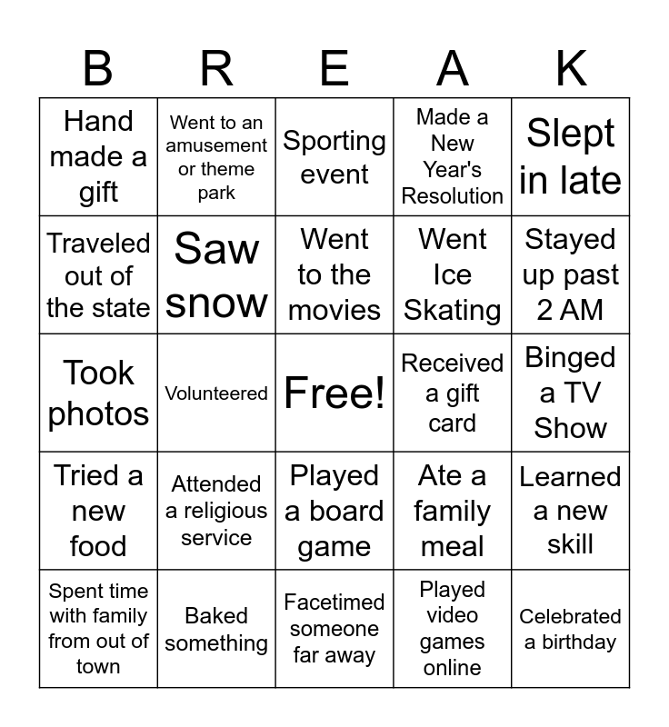 This bingo card has a free space and 24 words: Attended a religious service, Baked something, Went to the movies, Spent time with family from out of town, Slept in late, Hand made a gift, Traveled out of the state, Went to an amusement or theme park, Received a gift card, Played a board game, Went Ice Skating, Took photos, Ate a family meal, Learned a new skill, Saw snow, Played video games online, Binged a TV Show, Sporting event, Stayed up past 2 AM, Volunteered, Celebrated a birthday, Tried a new food, Made a New Year's Resolution and Facetimed someone far away.