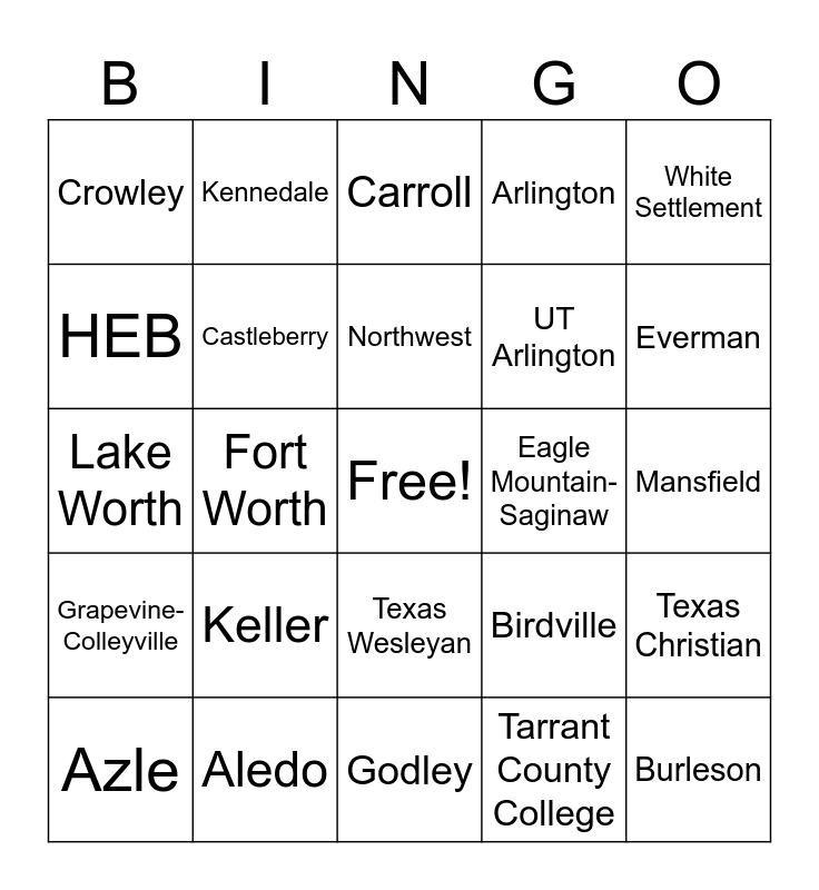 This bingo card has a free space and 24 words: Keller, Aledo, Northwest, Azle, White Settlement, Crowley, HEB, Kennedale, Eagle Mountain-Saginaw, Texas Wesleyan, UT Arlington, Lake Worth, Birdville, Texas Christian, Castleberry, Tarrant County College, Mansfield, Carroll, Everman, Fort Worth, Burleson, Grapevine-Colleyville, Arlington and Godley.