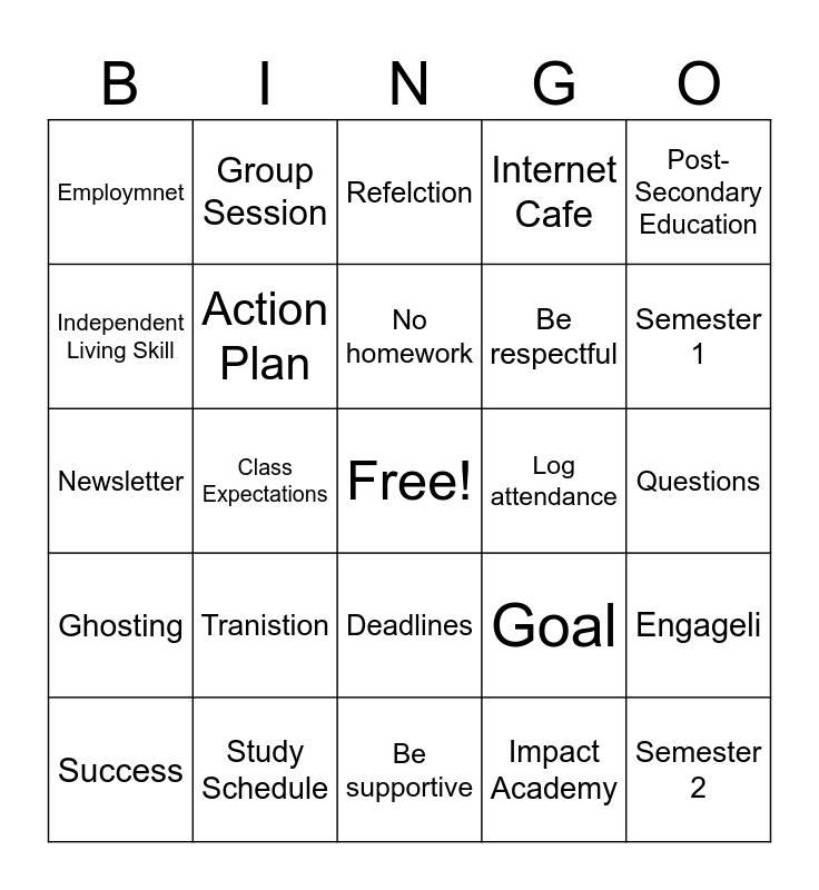 This bingo card has a free space and 24 words: Tranistion, Study Schedule, No homework, Success, Post- Secondary Education, Employmnet, Independent Living Skill, Group Session, Log attendance, Deadlines, Be respectful, Newsletter, Goal, Engageli, Action Plan, Impact Academy, Questions, Refelction, Semester 1, Class Expectations, Semester 2, Ghosting, Internet Cafe and Be supportive.