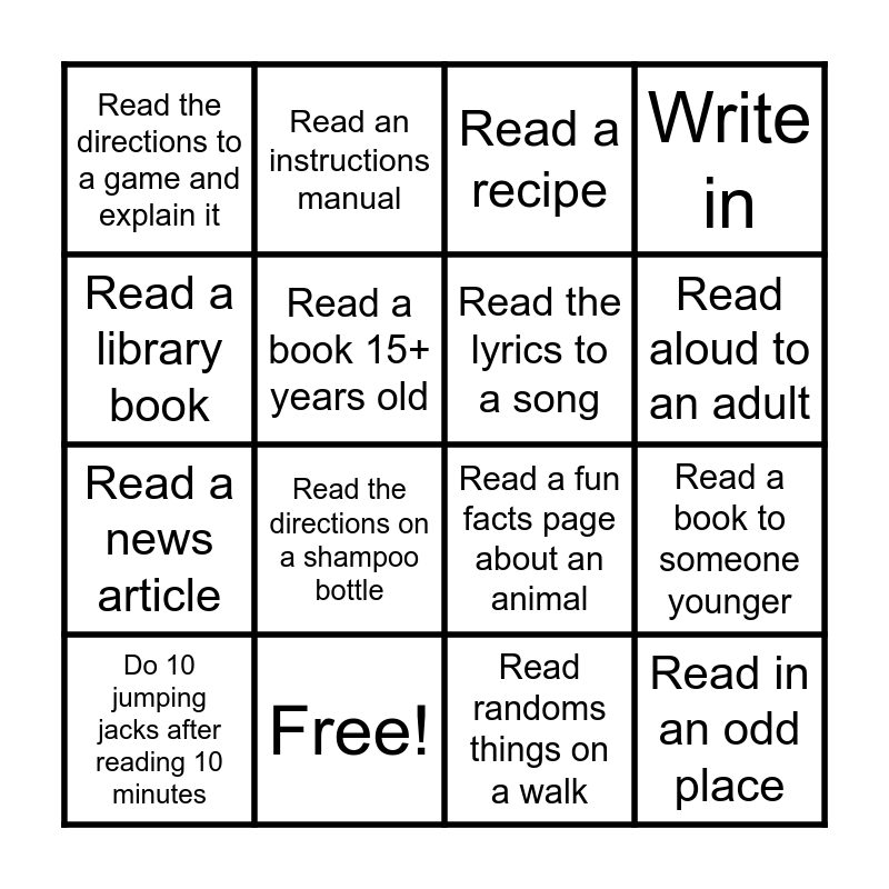 This bingo card has 16 words: Free!, Read a book to someone younger, Read a recipe, Read the directions to a game and explain it, Read a news article, Read an instructions manual, Read a fun facts page about an animal, Read randoms things on a walk, Read a library book, Read a book 15+ years old, Do 10 jumping jacks after reading 10 minutes, Write in, Read the directions on a shampoo bottle, Read aloud to an adult, Read the lyrics to a song and Read in an odd place.