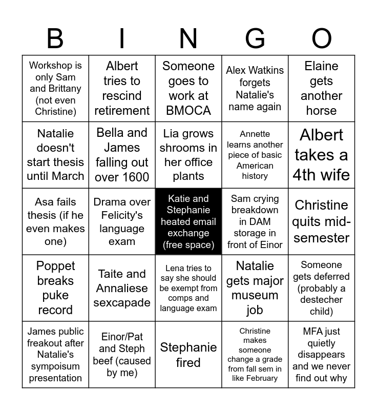 This bingo card has a free space and 24 words: Taite and Annaliese sexcapade, Einor/Pat and Steph beef (caused by me), Lia grows shrooms in her office plants, James public freakout after Natalie's sympoisum presentation, Elaine gets another horse, Workshop is only Sam and Brittany (not even Christine), Natalie doesn't start thesis until March, Albert tries to rescind retirement, Sam crying breakdown in DAM storage in front of Einor, Lena tries to say she should be exempt from comps and language exam, Annette learns another piece of basic American history, Asa fails thesis (if he even makes one), Natalie gets major museum job, Someone gets deferred (probably a destecher child), Bella and James falling out over 1600, Christine makes someone change a grade from fall sem in like February, Christine quits mid-semester, Someone goes to work at BMOCA, Albert takes a 4th wife, Drama over Felicity's language exam, MFA just quietly disappears and we never find out why, Poppet breaks puke record, Alex Watkins forgets Natalie's name again and Stephanie fired.