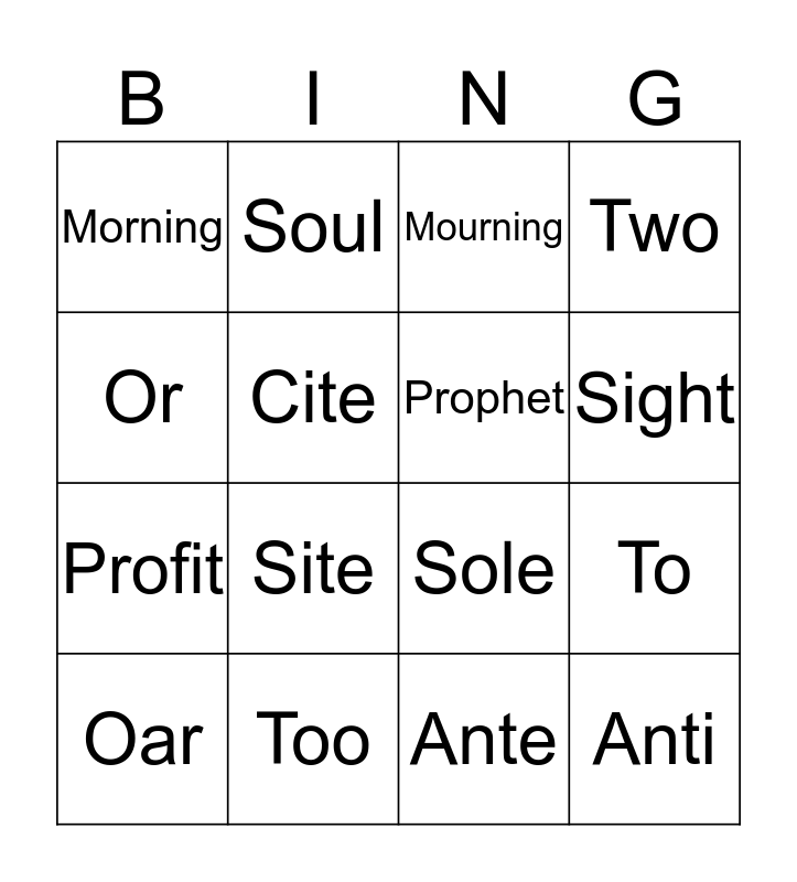 This bingo card has a free space and 15 words: Oar, Anti, Mourning, Morning, Sight, Or, Site, Ante, Cite, Profit, To, Two, Prophet, Soul and Too.