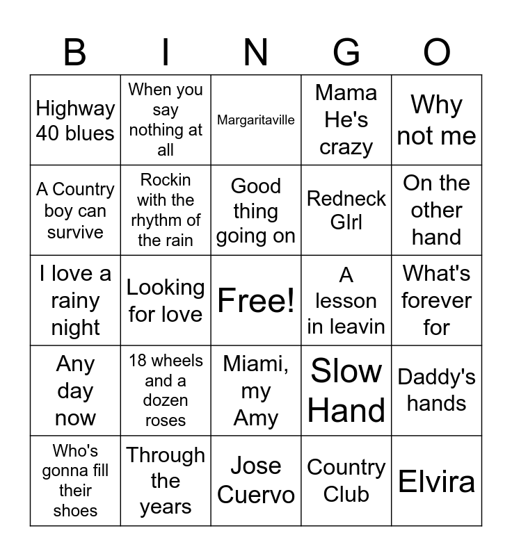 This bingo card has a free space and 77 words: 9 to 5, Deeper than the holler, Margaritaville, Song of the South, Always on my mind, Amarillo by morning, Dinosaur, Louisiana Saturday Night, If heaven ain't a lot like Dixie, Forever and ever, Amen, Pancho and Lefty, Angel of the morning, Good thing going on, A Country boy can survive, Seven Spanish Angels, Looking for love, If you're gonna play in Texas, Elvira, Fancy Free, Why not me, Fishing in the dark, I love a rainy night, Rockin with the rhythm of the rain, When you say nothing at all, Mama He's crazy, Gone Country, Digging up bones, Killin Time, All my ex's live in Texas, There's no getting over me, Bette Davis Eyes, The FIreman, Maybe it was Memphis, Slow Hand, On the other hand, Redneck GIrl, Guitars and Cadillacs, Why'd you come in here looking like that, What's forever for, Country Club, Real Love, Islands in the stream, He stopped loving her today, Little Rock, Queen of hearts, I believe in you, Who's gonna fill their shoes, Highway 40 blues, Somebody's knockin, Swingin, On the road again, Miami, my Amy, We've go tonight, I will always love you, Grandpa, Theme from "The Dukes of Hazzard", Don't close your eyes, I was country when country wasn't cool, Lady, Mountain music, 18 wheels and a dozen roses, Whoever's in New England, Baby's got her blue jeans on, Tight fitting jeans, Love me like you used to, Two dozen roses, I told you so, A lesson in leavin, I wouldn't have missed it for the world, She got the goldmine, You look so good in love, Daddy's hands, Any day now, Through the years, I think I'll just stay here and drink, Jose Cuervo and Crackers.
