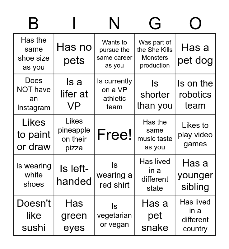 This bingo card has a free space and 24 words: Is left-handed, Has green eyes, Is currently on a VP athletic team, Doesn't like sushi, Has a pet dog, Has the same shoe size as you, Does NOT have an Instagram, Has no pets, Has the same music taste as you, Is wearing a red shirt, Is shorter than you, Likes to paint or draw, Has lived in a different state, Has a younger sibling, Is a lifer at VP, Has a pet snake, Likes to play video games, Wants to pursue the same career as you, Is on the robotics team, Likes pineapple on their pizza, Has lived in a different country, Is wearing white shoes, Was part of the She Kills Monsters production and Is vegetarian or vegan.