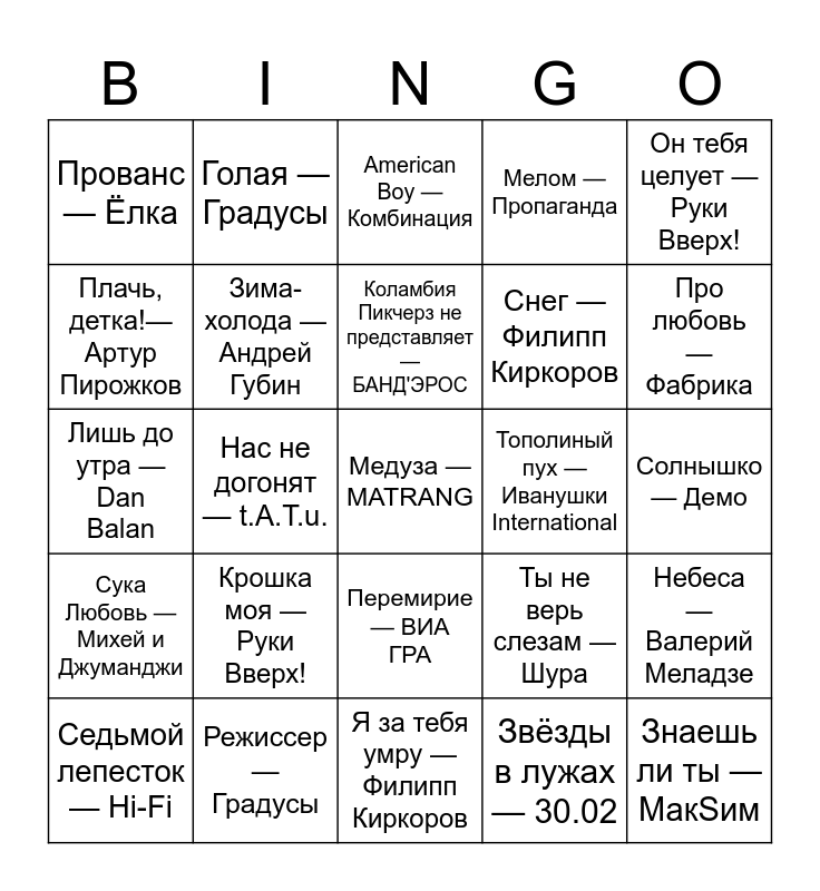 This bingo card has 36 words: Тучи — Иванушки International, Хоп хэй лала лэй — Леонид Агутин, Самба белого мотылька — Валерий Меладзе, Зима-холода — Андрей Губин, Ты не верь слезам — Шура, Сука Любовь — Михей и Джуманджи, Коламбия Пикчерз не представляет — БАНД'ЭРОС, Другая причина — НЕПАРА, Он тебя целует — Руки Вверх!, Маршрутка — IOWA, Нас не догонят — t.A.T.u., Мелом — Пропаганда, Пчеловод — RASA, Тополиный пух — Иванушки International, Про любовь — Фабрика, Прованс — Ёлка, Знаешь ли ты — МакSим, Крошка моя — Руки Вверх!, Медуза — MATRANG, American Boy — Комбинация, Солнышко — Демо, Небеса — Валерий Меладзе, Режиссер — Градусы, Седьмой лепесток — Hi-Fi, Я за тебя умру — Филипп Киркоров, Голая — Градусы, Лишь до утра — Dan Balan, Одиночество-сука — Слава, Снег — Филипп Киркоров, Плачь, детка!— Артур Пирожков, Гуф - Ice baby, ТРАВМА, Винтаж - Плохая девочка, Звёзды в лужах — 30.02, Перемирие — ВИА ГРА, Солнышко — Демо and Мираж - Музыка нас связала.