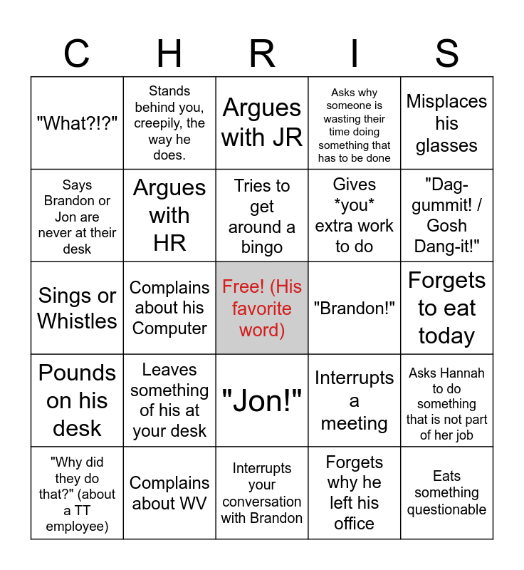 This bingo card has a free space and 30 words: Complains about WV, Rushes to Software, Complains about his Computer, Tells you a story about his childhood, "What?!?", Argues with JR, Argues with HR, "Jon!", "Brandon!", Interrupts your conversation with Brandon, Forgets to eat today, Eats something questionable, Forgets why he left his office, Breaks a spreadsheet, "Dag-gummit! / Gosh Dang-it!", Argues with Linda, Interrupts a meeting, Pounds on his desk, Leaves something of his at your desk, Misplaces his glasses, Sings or Whistles, Complains about it being cold, Stands behind you, creepily, the way he does., Gives *you* extra work to do, Says Brandon or Jon are never at their desk, Asks why someone is wasting their time doing something that has to be done, Asks Hannah to do something that is not part of her job, "Why did they do that?" (about a TT employee), Tries to get around a bingo and Grabs the wrong number of checks.