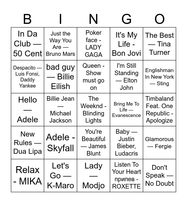 This bingo card has 36 words: Rolling In The Deep — Adele, Diamonds — Rihanna, Ed Sheeran - Shape of You, bad guy — Billie Eilish, Baby — Justin Bieber, Ludacris, New Rules — Dua Lipa, Queen - Show must go on, Let's Get It Started — Black Eyed Peas, The Best — Tina Turner, Californication — Red Hot Chili Peppers, Billie Jean — Michael Jackson, It's My Life - Bon Jovi, Summertime Sadness — Lana Del Rey, Bring Me To Life — Evanescence, Englishman In New York — Sting, In Da Club — 50 Cent, Don't Speak — No Doubt, Adele - Skyfall, The Weeknd - Blinding Lights, Poker face -LADY GAGA, Timbaland Feat. One Republic - Apologize, Glamorous — Fergie, Let's Go — K-Maro, Relax - MIKA, Lady — Modjo, Just the Way You Are — Bruno Mars, Hello — Adele, Personal Jesus — Depeche Mode, I'm Still Standing — Elton John, Despacito — Luis Fonsi, Daddy Yankee, I Kissed A Girl — Katy Perry, Wind Of Change — Scorpions, Listen To Your Heart припев - ROXETTE, You're Beautiful — James Blunt, Blue Suede Shoes — Elvis Presley and Oh, Pretty Woman — Roy Orbison.