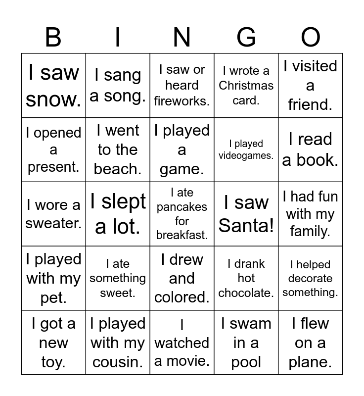 This bingo card has 25 words: I ate something sweet., I watched a movie., I played a game., I got a new toy., I visited a friend., I saw snow., I opened a present., I sang a song., I saw Santa!, I drew and colored., I played videogames., I wore a sweater., I drank hot chocolate., I helped decorate something., I went to the beach., I flew on a plane., I had fun with my family., I saw or heard fireworks., I read a book., I slept a lot., I ate pancakes for breakfast., I played with my cousin., I played with my pet., I wrote a Christmas card. and I swam in a pool.