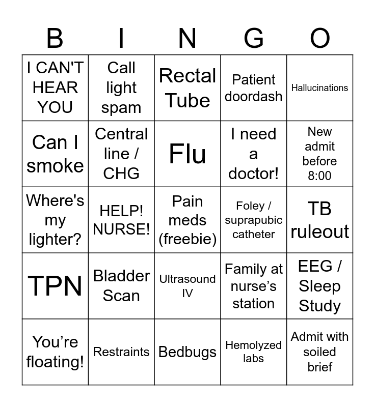 This bingo card has a free space and 52 words: Active bed alarm, Admit with soiled brief, AMA, Bedbugs, Bladder Scan, Broken TV, Call light spam, Called security, Can I smoke, CDiff, Central line / CHG, Code brown mid-check & change, EEG / Sleep Study, Family at nurse’s station, Fired the nurse, Flirting with staff, Flu, Foley / suprapubic catheter, Frequent Flier, Hallucinations, HELP! NURSE!, Hemolyzed labs, I CAN'T HEAR YOU, I need a doctor!, Lasix, Missed meal/can I have a sandwich, MRSA, Need a translator, New admit before 8:00, No phleb, No supplies, Patient doordash, Pulled off tele stickers, Pulled out IV, Racist / misogynist patient, Rectal Tube, Restraints, RSV, Short staffed/free pizza, Sitter, Straight Cath, TB ruleout, TPN, Tube feed, Ultrasound IV, Uses trash can as a urinal, Uses water jug as a urinal, Where's my lighter?, Withdrawals, Workplace violence, You’re floating! and You’re precepting!.