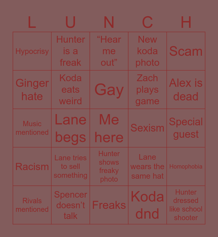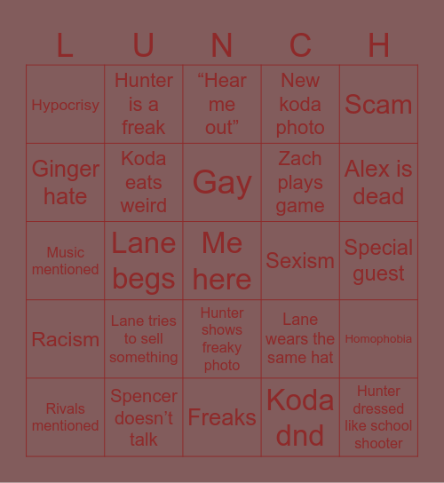 This bingo card has a free space and 24 words: Lane tries to sell something, Spencer doesn’t talk, Gay, Rivals mentioned, Scam, Hypocrisy, Ginger hate, Hunter is a freak, Sexism, Hunter shows freaky photo, Zach plays game, Music mentioned, Lane wears the same hat, Homophobia, Koda eats weird, Koda dnd, Special guest, “Hear me out”, Alex is dead, Lane begs, Hunter dressed like school shooter, Racism, New koda photo and Freaks.