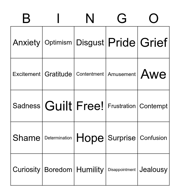 This bingo card has a free space and 35 words: Joy, Happiness, Love, Gratitude, Hope, Pride, Excitement, Enthusiasm, Contentment, Relief, Sadness, Grief, Anger, Fear, Anxiety, Frustration, Disappointment, Guilt, Shame, Jealousy, Surprise, Curiosity, Confusion, Boredom, Disgust, Awe, Compassion, Nostalgia, Amusement, Contempt, Worry, Humility, Determination, Optimism and Pessimism.