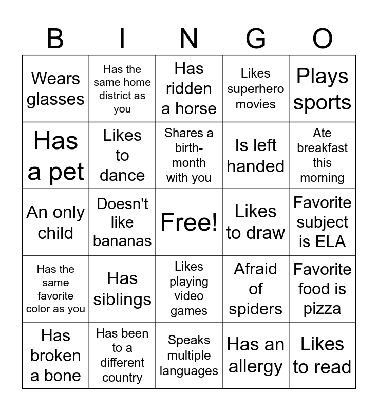 This bingo card has a free space and 24 words: Has siblings, Has been to a different country, Shares a birth- month with you, Has broken a bone, Plays sports, Wears glasses, Has a pet, Has the same home district as you, Likes to draw, Likes playing video games, Is left handed, An only child, Afraid of spiders, Favorite food is pizza, Likes to dance, Has an allergy, Favorite subject is ELA, Has ridden a horse, Ate breakfast this morning, Doesn't like bananas, Likes to read, Has the same favorite color as you, Likes superhero movies and Speaks multiple languages.