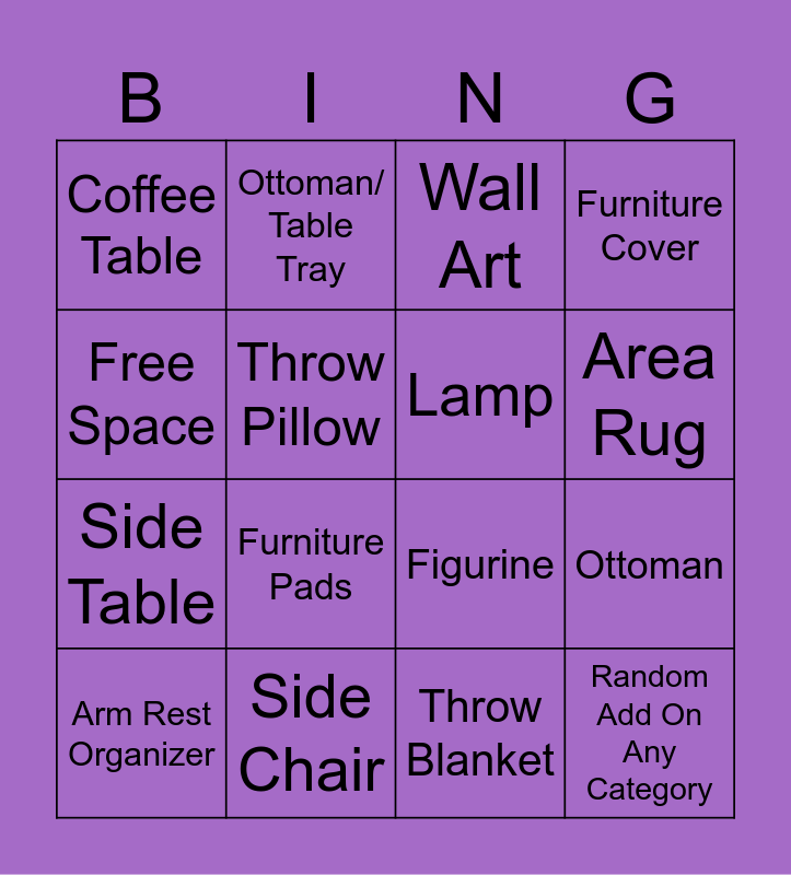 This bingo card has 16 words: Side Chair, Ottoman, Wall Art, Coffee Table, Side Table, Ottoman/ Table Tray, Figurine, Throw Blanket, Free Space, Throw Pillow, Arm Rest Organizer, Furniture Cover, Furniture Pads, Area Rug, Lamp and Random Add On Any Category.
