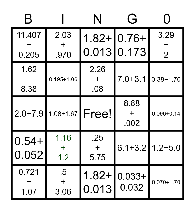 This bingo card has a free space and 24 words: 1.16 + 1.2, .5 + 3.06, 2.26 + .08, 0.721 + 1.07, 3.29 + 2, 11.407 + 0.205, 1.62 + 8.38, 2.03 + .970, 8.88 + .002, .25 + 5.75, 7.0+3.1, 2.0+7.9, 6.1+3.2, 1.2+5.0, 0.195+1.06, 0.033+ 0.032, 0.096+0.14, 1.82+ 0.013, 0.38+1.70, 1.08+1.67, 0.070+1.70, 0.54+ 0.052, 0.76+ 0.173 and 1.82+ 0.013.