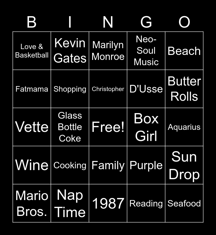 This bingo card has a free space and 29 words: Mario Bros., Painting, Glass Bottle Coke, Red Lipstick, Love & Basketball, Marilyn Monroe, Shopping, Cooking, Box Girl, Nap Time, Aquarius, Seafood, 1987, Reading, Butter Rolls, Amethyst, Family, Wine, Beach, Vette, Purple, 38, D'Usse, Fatmama, Neo-Soul Music, Kevin Gates, Sun Drop, Christopher and Crime TV.