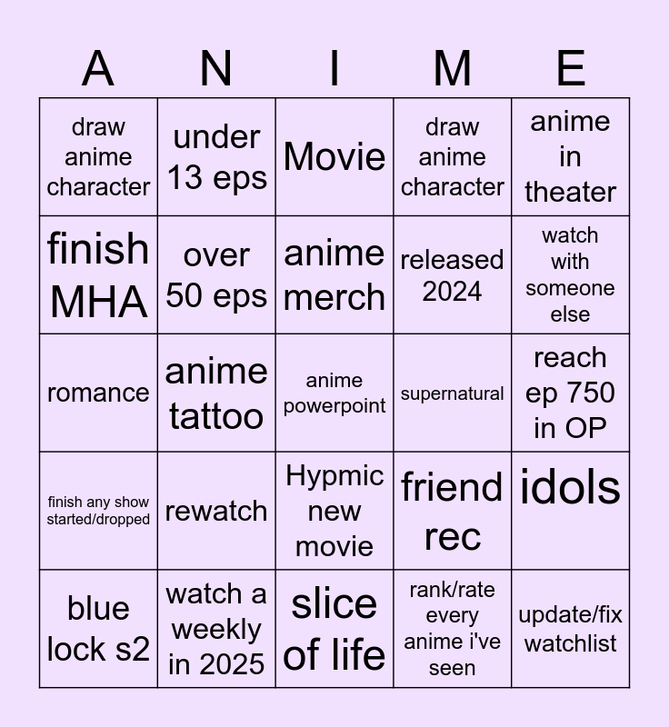 This bingo card has a free space and 24 words: rewatch, watch a weekly in 2025, anime merch, blue lock s2, anime in theater, draw anime character, finish MHA, under 13 eps, supernatural, Hypmic new movie, released 2024, romance, friend rec, idols, over 50 eps, rank/rate every anime i've seen, reach ep 750 in OP, Movie, watch with someone else, anime tattoo, update/fix watchlist, finish any show started/dropped, draw anime character and slice of life.
