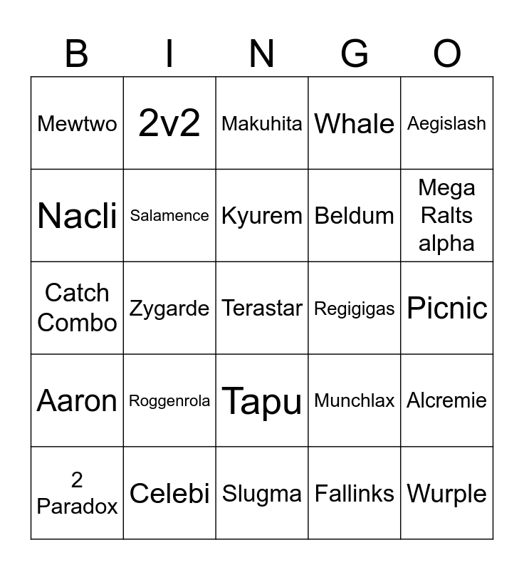 This bingo card has 40 words: Pelago, Catch Combo, Zigzagoon, Salamence, Celebi, Tapu, Kyurem, Dogos, Aegislash, Aaron, Zygarde, Whale, Terastar, Picnic, Regigigas, Roggenrola, Porygon, Mewtwo, Minior, Makuhita, Alcremie, Fallinks, Beldum, Nacli, Sandygast, Furfrou, Unown, ORAS, Wurple, Dragonite SV, Reddit, 2 Paradox, Dudunsparce 3-s, Munchlax, Mega Ralts alpha, Slugma, dust, fossil cranidos, 2v2 and Rayquaza.