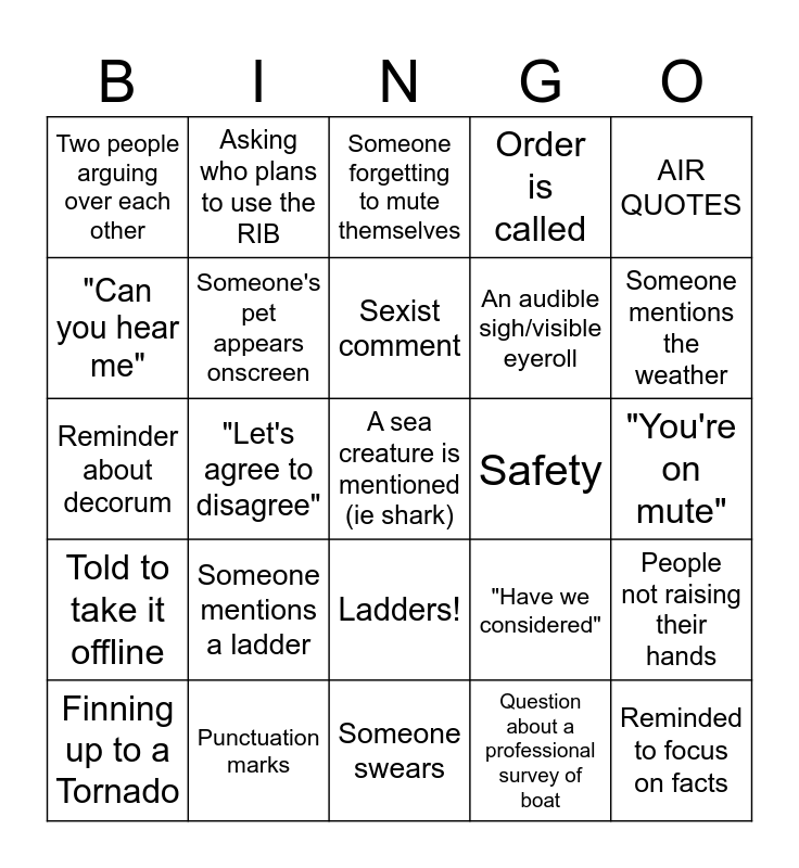 This bingo card has a free space and 24 words: Someone mentions a ladder, Punctuation marks, Sexist comment, Finning up to a Tornado, AIR QUOTES, Two people arguing over each other, "Can you hear me", Asking who plans to use the RIB, Safety, Ladders!, An audible sigh/visible eyeroll, Reminder about decorum, "Have we considered", People not raising their hands, Someone's pet appears onscreen, Question about a professional survey of boat, "You're on mute", Someone forgetting to mute themselves, Someone mentions the weather, "Let's agree to disagree", Reminded to focus on facts, Told to take it offline, Order is called and Someone swears.