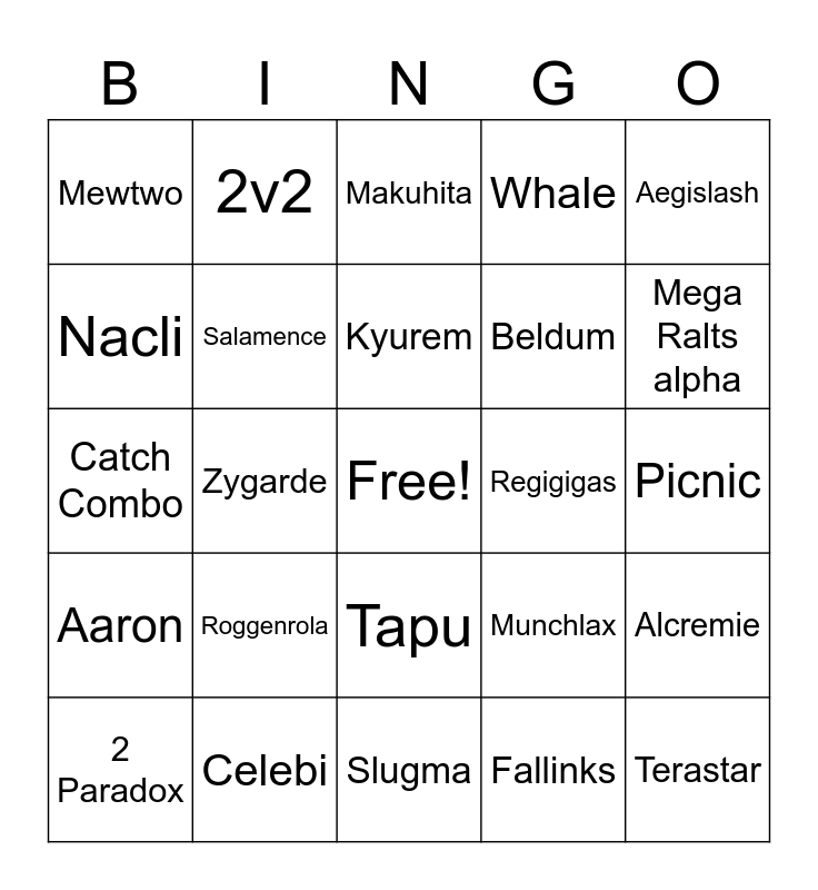 This bingo card has a free space and 40 words: Pelago, Catch Combo, Zigzagoon, Salamence, Celebi, Tapu, Kyurem, Dogos, Aegislash, Aaron, Zygarde, Whale, Terastar, Picnic, Regigigas, Roggenrola, Porygon, Mewtwo, Minior, Makuhita, Alcremie, Fallinks, Beldum, Nacli, Sandygast, Furfrou, Unown, ORAS, Wurple, Dragonite SV, Reddit, 2 Paradox, Dudunsparce 3-s, Munchlax, Mega Ralts alpha, Slugma, dust, fossil cranidos, 2v2 and Rayquaza.