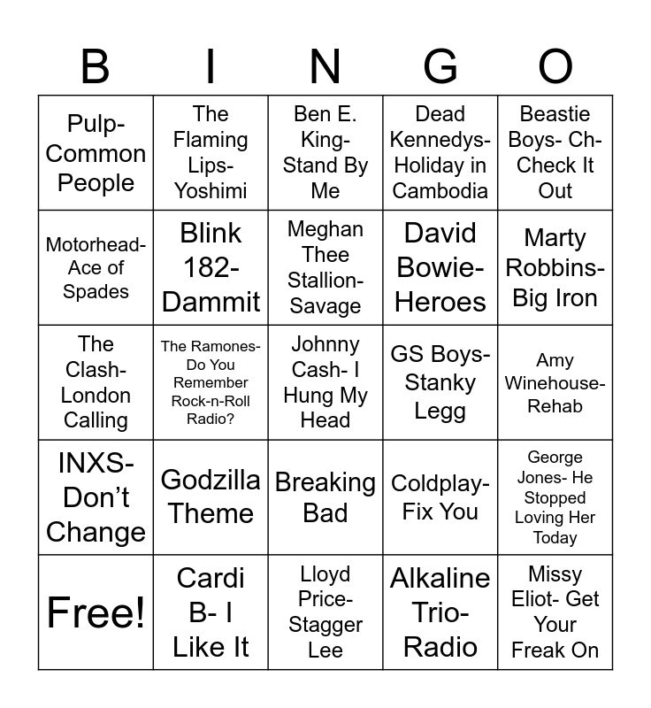 This bingo card has 29 words: Free!, Kendrick Lamar- Squabble Up, The Ramones- Do You Remember Rock-n-Roll Radio?, Missy Eliot- Get Your Freak On, Pulp- Common People, Ben E. King- Stand By Me, Blink 182- Dammit, Godzilla Theme, GS Boys- Stanky Legg, Cardi B- I Like It, Amy Winehouse- Rehab, Johnny Cash- I Hung My Head, Lloyd Price- Stagger Lee, Alkaline Trio- Radio, Marty Robbins- Big Iron, The Crystals- Then He Kissed Me, Breaking Bad, INXS- Don’t Change, Beastie Boys- Ch-Check It Out, The Clash- London Calling, Coldplay- Fix You, Damien Marley- Welcome To Jamrock, David Bowie- Heroes, Motorhead- Ace of Spades, Dead Kennedys- Holiday in Cambodia, The Flaming Lips- Yoshimi, George Jones- He Stopped Loving Her Today, Meghan Thee Stallion- Savage and Charli XCX- 365.
