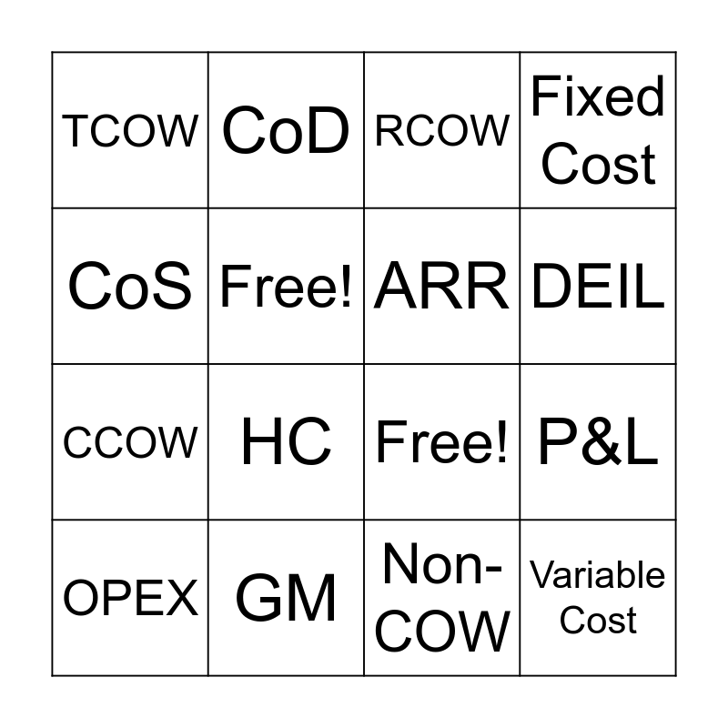 This bingo card has 16 words: GM, P&L, RCOW, TCOW, CCOW, CoD, Free!, Non-COW, CoS, Free!, OPEX, Fixed Cost, HC, DEIL, ARR and Variable Cost.