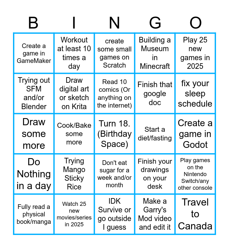 This bingo card has a free space and 24 words: Trying Mango Sticky Rice, Watch 25 new movies/series in 2025, Read 10 comics (Or anything on the internet), Fully read a physical book/manga, Play 25 new games in 2025, Create a game in GameMaker, Trying out SFM and/or Blender, Workout at least 10 times a day, Start a diet/fasting, Don't eat sugar for a week and/or month, Finish that google doc, Draw some more, Finish your drawings on your desk, Play games on the Nintendo Switch/any other console, Draw digital art or sketch on Krita, Make a Garry's Mod video and edit it, Create a game in Godot, create some small games on Scratch, fix your sleep schedule, Cook/Bake some more, Travel to Canada, Do Nothing in a day, Building a Museum in Minecraft and IDK Survive or go outside I guess.
