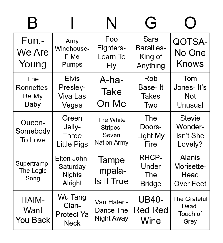 This bingo card has 29 words: HAIM- Want You Back, Green Day- Church on Sunday, Green Jelly- Three Little Pigs, The Grateful Dead- Touch of Grey, Fun.- We Are Young, Foo Fighters- Learn To Fly, Elvis Presley- Viva Las Vegas, Elton John- Saturday Nights Alright, The Doors- Light My Fire, Wu Tang Clan- Protect Ya Neck, Stevie Wonder- Isn’t She Lovely?, The White Stripes- Seven Nation Army, Van Halen- Dance The Night Away, UB40- Red Red Wine, Tom Jones- It’s Not Unusual, Staind- It’s Been Awhile, Tampe Impala- Is It True, Supertramp- The Logic Song, QOTSA- No One Knows, Queen- Somebody To Love, RHCP- Under The Bridge, Rednex- Cotton Eyed Joe, Rob Base- It Takes Two, The Ronnettes- Be My Baby, Sara Barallies- King of Anything, Amy Winehouse- F Me Pumps, Alanis Morisette- Head Over Feet, A-ha- Take On Me and Social Distortion- Ring of Fire.