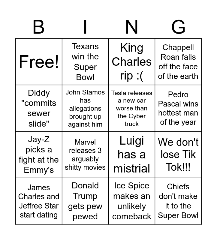 This bingo card has 16 words: James Charles and Jeffree Star start dating, Donald Trump gets pew pewed, King Charles rip :(, Chappell Roan falls off the face of the earth, Diddy "commits sewer slide", Texans win the Super Bowl, Luigi has a mistrial, We don't lose Tik Tok!!!, Free!, John Stamos has allegations brought up against him, Ice Spice makes an unlikely comeback, Pedro Pascal wins hottest man of the year, Jay-Z picks a fight at the Emmy's, Marvel releases 3 arguably shitty movies, Tesla releases a new car worse than the Cyber truck and Chiefs don't make it to the Super Bowl.