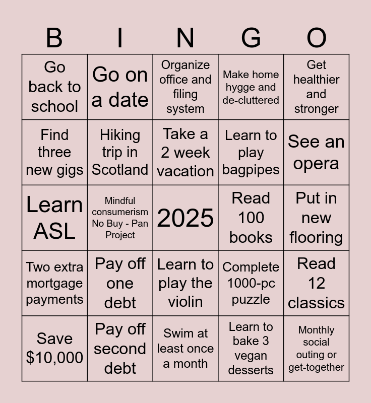 This bingo card has a free space and 24 words: Pay off one debt, Pay off second debt, Take a 2 week vacation, Save $10,000, Get healthier and stronger, Go back to school, Find three new gigs, Go on a date, Read 100 books, Learn to play the violin, Learn to play bagpipes, Learn ASL, Complete 1000-pc puzzle, Read 12 classics, Hiking trip in Scotland, Learn to bake 3 vegan desserts, Put in new flooring, Organize office and filing system, See an opera, Mindful consumerism No Buy - Pan Project, Monthly social outing or get-together, Two extra mortgage payments, Make home hygge and de-cluttered and Swim at least once a month.