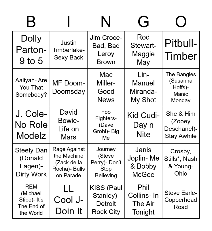 This bingo card has 26 words: Journey (Steve Perry)- Don’t Stop Believing, Phil Collins- In The Air Tonight, Mac Miller- Good News, LL Cool J- Doin It, Pitbull- Timber, Dolly Parton- 9 to 5, Aaliyah- Are You That Somebody?, Justin Timberlake- Sexy Back, She & Him (Zooey Deschanel)- Stay Awhile, Janis Joplin- Me & Bobby McGee, Lin-Manuel Miranda- My Shot, J. Cole- No Role Modelz, Crosby, Stills*, Nash & Young- Ohio, REM (Michael Stipe)- It’s The End of the World, David Bowie- Life on Mars, Pat Benetar- Love is a Battlefield, Rod Stewart- Maggie May, Steely Dan (Donald Fagen)- Dirty Work, Jim Croce- Bad, Bad Leroy Brown, Foo Fighters- (Dave Grohl)- Big Me, The Bangles (Susanna Hoffs)- Manic Monday, KISS (Paul Stanley)- Detroit Rock City, Kid Cudi- Day n Nite, Rage Against the Machine (Zack de la Rocha)- Bulls on Parade, MF Doom- Doomsday and Steve Earle- Copperhead Road.