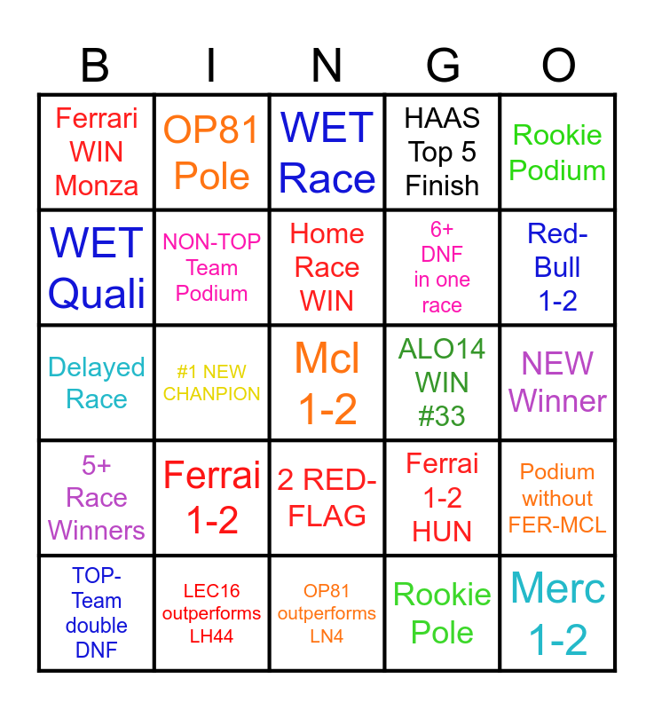 This bingo card has 25 words: Ferrai 1-2, OP81 outperforms LN4, Home Race WIN, TOP-Team double DNF, Rookie Podium, Ferrari WIN Monza, WET Quali, OP81 Pole, ALO14 WIN #33, 2 RED-FLAG, 6+ DNF in one race, Delayed Race, Ferrai 1-2 HUN, Podium without FER-MCL, NON-TOP Team Podium, Merc 1-2, NEW Winner, WET Race, Red-Bull 1-2, #1 NEW CHANPION, Mcl 1-2, LEC16 outperforms LH44, 5+ Race Winners, HAAS Top 5 Finish and Rookie Pole.