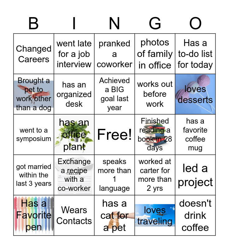 This bingo card has 8 images, a free space and 24 words: Exchange a recipe with a co-worker, Wears Contacts, Achieved a BIG goal last year, Has a Favorite pen, Has a to-do list for today, Changed Careers, Brought a pet to work other than a dog, went late for a job interview, Finished reading a book in 28 days, speaks more than 1 language, works out before work, went to a symposium, worked at carter for more than 2 yrs, led a project, has an organized desk, loves traveling, has a favorite coffee mug, pranked a coworker, loves desserts, has an office plant, doesn't drink coffee, got married within the last 3 years, photos of family in office and has a cat for a pet.