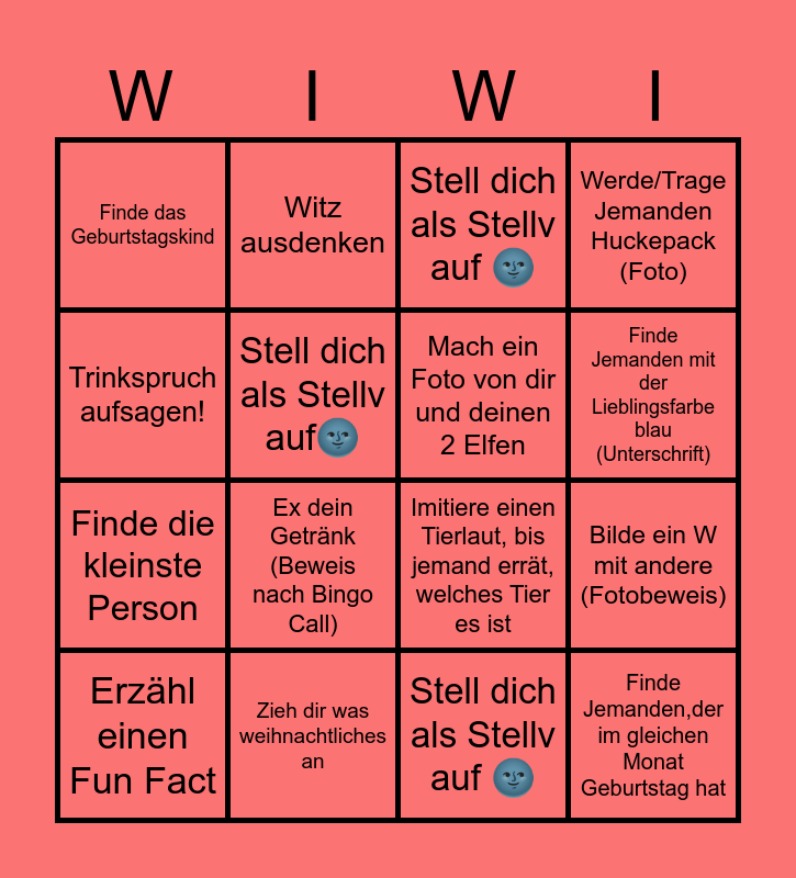This bingo card has 25 words: Foto mit Hannes, Unterschrift von Vorstand, Finde Jemanden mit der Lieblingsfarbe blau (Unterschrift), Mal ein Bild:, Trinkspruch aufsagen!, Finde das Geburtstagskind, Stell dich als Stellv auf🌚, Witz ausdenken, Zieh dir was weihnachtliches an, Bau dir eine Weihnachtsmütze aus ner Serviette, Finde die kleinste Person, Imitiere einen Tierlaut, bis jemand errät, welches Tier es ist, Erfinde mit 2 anderen Personen einen kurzen Party-Song und performt ihn, Denk dir mit Jemanden einen Handschlag aus (Demonstration muss geliefert werden), Mach ein Foto von dir und deinen 2 Elfen, Erzähl eine Weisheit, Stell dich als Stellv auf 🌚, Stell dich als Stellv auf 🌚, Ex dein Getränk (Beweis nach Bingo Call), Bilde ein W mit andere (Fotobeweis), Erzähl einen Fun Fact, Tausch ein Kleidungsstück, Finde Jemanden,der im gleichen Monat Geburtstag hat, Werde/Trage Jemanden Huckepack (Foto) and Wirf Jemanden essen in den Mund (Trickshot).