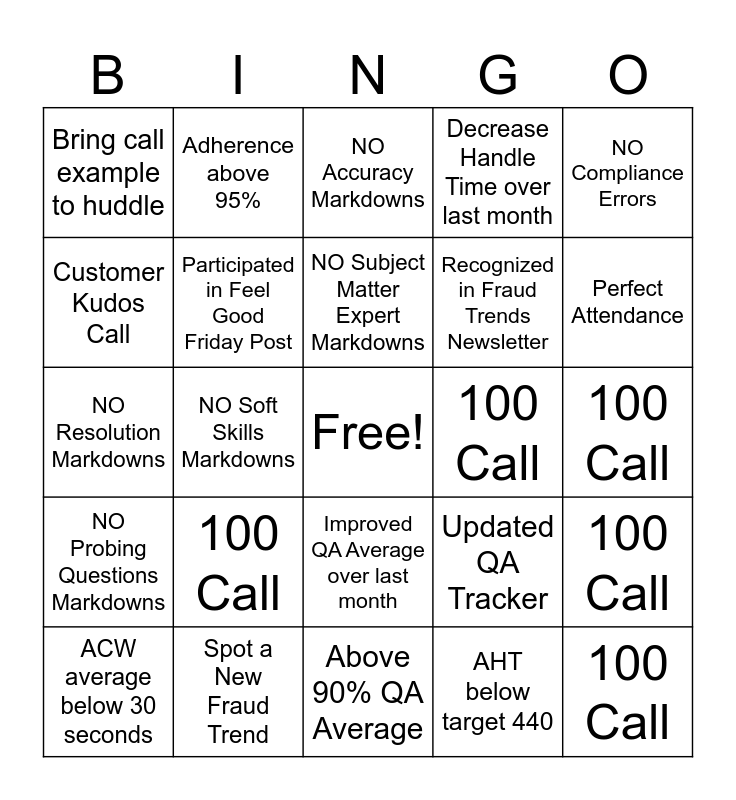This bingo card has a free space and 24 words: 100 Call, Spot a New Fraud Trend, NO Subject Matter Expert Markdowns, ACW average below 30 seconds, NO Compliance Errors, Bring call example to huddle, Customer Kudos Call, Adherence above 95%, 100 Call, Improved QA Average over last month, Recognized in Fraud Trends Newsletter, NO Resolution Markdowns, Updated QA Tracker, 100 Call, Participated in Feel Good Friday Post, AHT below target 440, 100 Call, NO Accuracy Markdowns, Perfect Attendance, NO Soft Skills Markdowns, 100 Call, NO Probing Questions Markdowns, Decrease Handle Time over last month and Above 90% QA Average.