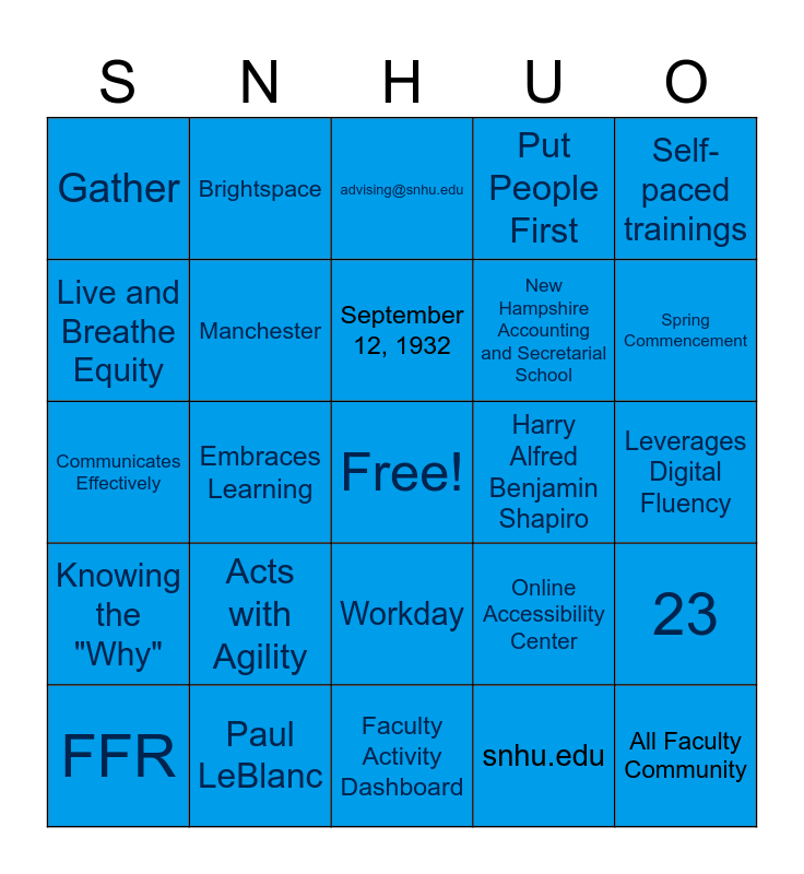 This bingo card has a free space and 61 words: Lisa Marsh Ryerson, Paul LeBlanc, 1932, Knowing the "Why", snhu.edu, COLT, Manchester, 1995, New Hampshire Accounting and Secretarial School, PULSE, Put People First, Unleash Your Learning, Live and Breathe Equity, Set the Right Pace, Embrace Collaboration, Gather, All Faculty Community, Self-paced trainings, Course Materials & Syllabi, September 12, 1932, Harry Alfred Benjamin Shapiro, advising@snhu.edu, FFR, 23, 150+, 100+, Shapiro Library, Fall Commencement, Spring Commencement, Mock Interviews, Academic Support, HelpU, RAT (Risk Assessment Team), AI Page, Brightspace, Practices Humility, Builds Relationships, Embraces Learning, Thinks Holistically, Communicates Effectively, Takes Responsibility, Acts with Agility, Leverages Digital Fluency, Office of Community Standards, Online Accessibility Center, Faculty Handbook, Team Lead, Career Services, Faculty Success Portal, Workday, Faculty Activity Dashboard, 24/7 Drop-In Tutoring, Written Feedback, Peer tutoring, Academic Coaching, SNHU Faculty Online Bookstore, SNHU Syllabus Library, Eight Weeks, Ten Weeks, eBooks and Digital Courseware.