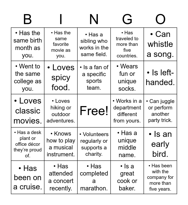 This bingo card has a free space and 49 words: • Speaks more than two languages., • Has been with the company for more than five years., • Is a coffee enthusiast., • Has completed a marathon., • Knows how to play a musical instrument., • Was born in another country., • Has the same favorite movie as you., • Owns a pet that isn’t a dog or cat., • Went to the same college as you., • Has met a celebrity., • Loves spicy food., • Has traveled to more than five countries., • Is an early bird., • Has a unique middle name., • Has a hidden talent., • Prefers tea over coffee., • Is a fan of a specific sports team., • Works in a department different from yours., • Has lived in more than three states., • Can whistle a song., • Loves hiking or outdoor adventures., • Is a great cook or baker., • Has the same birth month as you., • Wears fun or unique socks., • Has worked in a completely different industry before., • Is left-handed., • Has been on a cruise., • Has a favorite karaoke song., • Volunteers regularly or supports a charity., • Has a desk plant or office décor they’re proud of., • Collects something unique., • Has read more than three books this year., • Knows a funny office story., • Is great at trivia or puzzles., • Has attended a concert recently., • Has a favorite holiday tradition., • Prefers dogs over cats (or vice versa)., • Has run a successful side business or project., • Can juggle or perform another party trick., • Loves trying new restaurants., • Knows how to swim well., • Has been with the company for less than a year., • Owns a pair of bright or quirky shoes., • Has been skydiving or bungee jumping., • Loves classic movies., • Has a sibling who works in the same field., • Is an excellent storyteller., • Brings their lunch to work every day. and • Grew up in the same town or city as you..