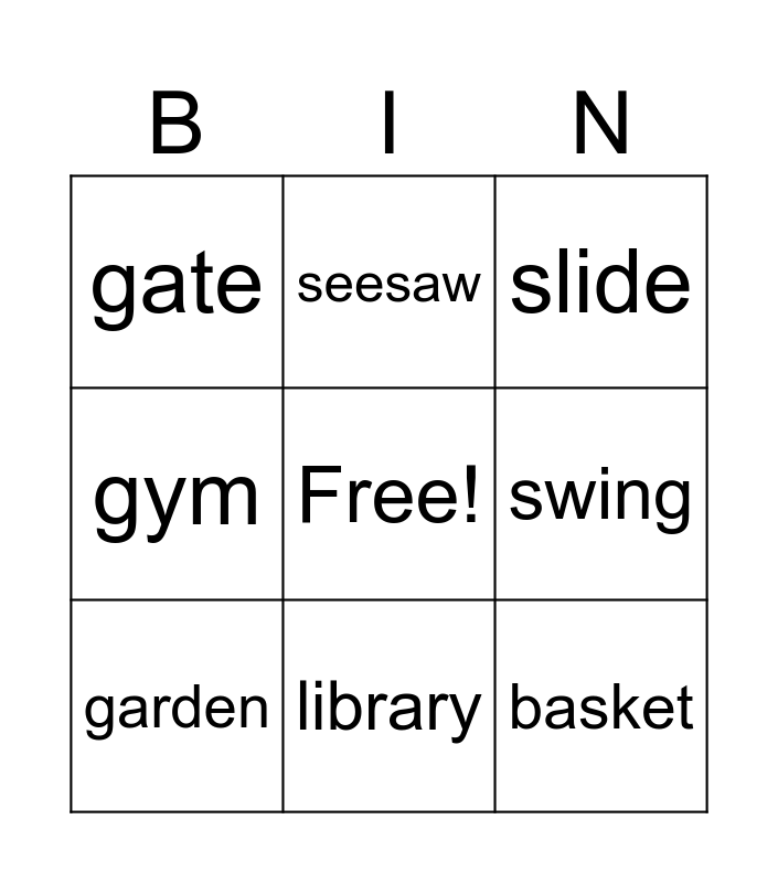 This bingo card has a free space and 8 words: swing, slide, seesaw, garden, gate, basket, gym and library.