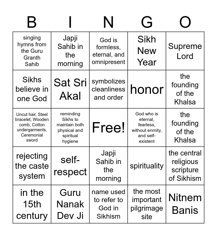 This bingo card has a free space and 59 words: One God, Guru Nanak Dev Ji, The Guru Granth Sahib, rejecting the caste system, the most important pilgrimage site, Kesh, Kara, Kanga, Kachera, Kirpan, Sat Sri Akal, gender equality, honor, Sikhs believe in karma and rebirth, Sikh New Year, through honest living, Sikhs believe in one God, Wonderful Teacher, the central religious scripture of Sikhism, singing hymns from the Guru Granth Sahib, Nitnem Banis, Supreme Lord, Seizer (of sin), symbolizes cleanliness and order, God who is eternal, fearless, without enmity, and self-existent, God is formless, eternal, and omnipresent, in the 15th century, the central religious scripture of Sikhism, equality among all people, symbolizing universal brotherhood and equality, Waheguru ji ka Khalsa, self-respect, the founding of the Khalsa, selfless service, God can be experienced directly through meditation and prayer., the most revered name for God in Sikhism, considered the eternal living Guru, creating a spiritual atmosphere, Japji Sahib in the morning, name used to refer to God in Sikhism, refer to God's ability to remove sins and grant liberation., reminding Sikhs to maintain both physical and spiritual hygiene, symbolizing universal brotherhood and equality, Uncut hair, Steel bracelet, Wooden comb, Cotton undergarments, Ceremonial sword, Waheguru ji ka Khalsa, self-respect, the founding of the Khalsa, selfless service, God can be experienced directly through meditation and prayer, the most revered name for God in Sikhism, considered the eternal living Guru, creating a spiritual atmosphere, Japji Sahib in the morning, name used to refer to God in Sikhism, refer to God's ability to remove sins and grant liberation., reminding Sikhs to maintain both physical and spiritual hygiene, the divine qualities that Sikhs want to embody in their lives, in the Punjab region of India, Waheguru Ji Ki Fateh, spirituality, similar to New Year celebrations in other cultures, congregation collectively remember and praise God and Japji Sahib in the morning.