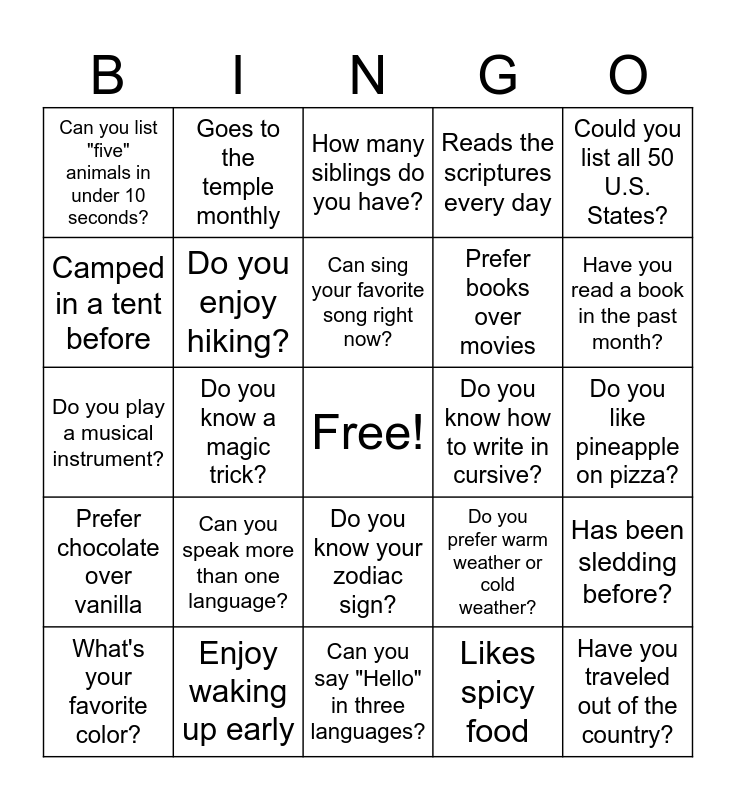 This bingo card has a free space and 29 words: What's your favorite color?, Do you know how to juggle?, Do you know a magic trick?, Can you do a funny impression or voice?, Can you list "five" animals in under 10 seconds?, How many siblings do you have?, Do you enjoy hiking?, Can you speak more than one language?, Do you know how to write in cursive?, Enjoy waking up early, Do you like pineapple on pizza?, Have you traveled out of the country?, Can you say "Hello" in three languages?, Likes spicy food, Have you read a book in the past month?, Have you been on a roller coaster?, Do you know your zodiac sign?, Prefer chocolate over vanilla, Could you list all 50 U.S. States?, Do you play a musical instrument?, Do you prefer warm weather or cold weather?, Can you say the alphabet backwards?, Prefer books over movies, Camped in a tent before, Reads the scriptures every day, Goes to the temple monthly, Has been sledding before?, Can sing your favorite song right now? and Enjoy cooking or baking.