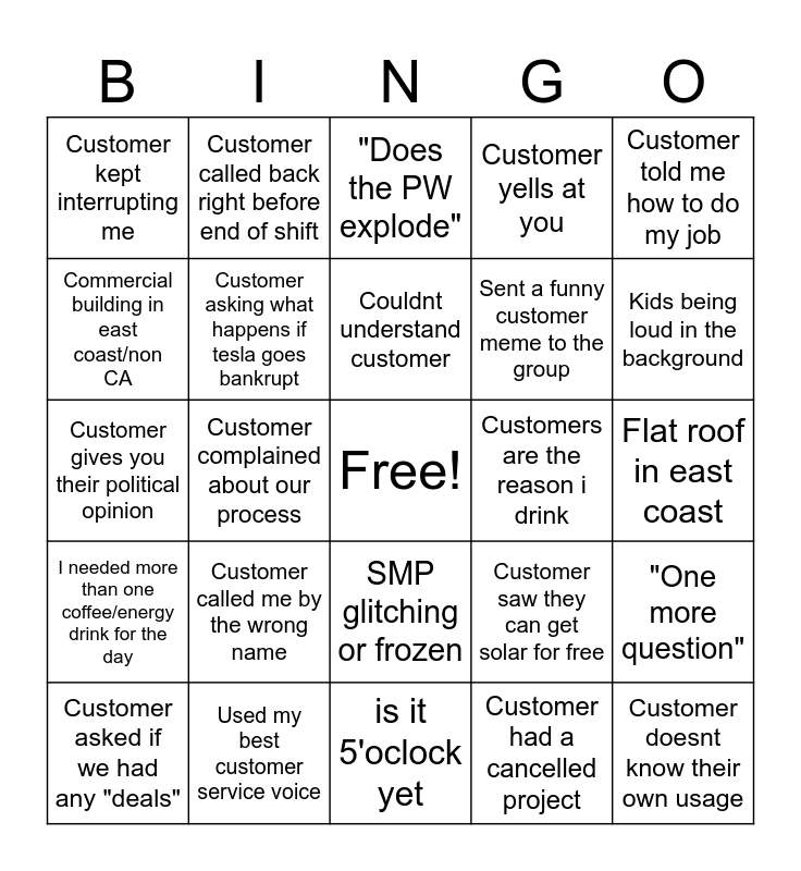 This bingo card has a free space and 24 words: Customer called me by the wrong name, Used my best customer service voice, Couldnt understand customer, Customer asked if we had any "deals", Customer told me how to do my job, Customer kept interrupting me, Commercial building in east coast/non CA, Customer called back right before end of shift, Customers are the reason i drink, SMP glitching or frozen, Sent a funny customer meme to the group, Customer gives you their political opinion, Customer saw they can get solar for free, "One more question", Customer asking what happens if tesla goes bankrupt, Customer had a cancelled project, Flat roof in east coast, "Does the PW explode", Kids being loud in the background, Customer complained about our process, Customer doesnt know their own usage, I needed more than one coffee/energy drink for the day, Customer yells at you and is it 5'oclock yet.
