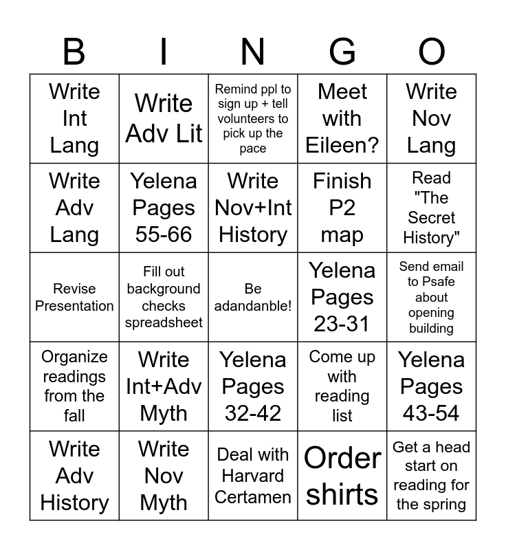 This bingo card has a free space and 24 words: Write Int+Adv Myth, Write Nov Myth, Write Nov+Int History, Write Adv History, Write Nov Lang, Write Int Lang, Write Adv Lang, Write Adv Lit, Yelena Pages 23-31, Yelena Pages 32-42, Finish P2 map, Revise Presentation, Come up with reading list, Yelena Pages 43-54, Yelena Pages 55-66, Order shirts, Send email to Psafe about opening building, Remind ppl to sign up + tell volunteers to pick up the pace, Read "The Secret History", Fill out background checks spreadsheet, Get a head start on reading for the spring, Organize readings from the fall, Meet with Eileen? and Deal with Harvard Certamen.