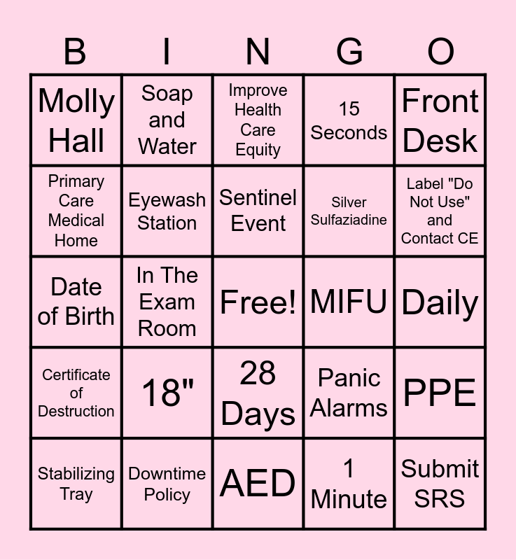 This bingo card has a free space and 24 words: 18", Downtime Policy, Sentinel Event, Stabilizing Tray, Front Desk, Molly Hall, Primary Care Medical Home, Soap and Water, MIFU, 28 Days, Silver Sulfaziadine, Date of Birth, Panic Alarms, PPE, Eyewash Station, 1 Minute, Daily, Improve Health Care Equity, Label "Do Not Use" and Contact CE, In The Exam Room, Submit SRS, Certificate of Destruction, 15 Seconds and AED.