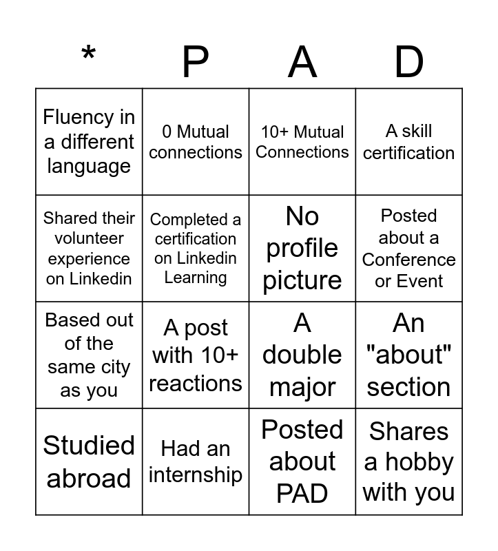 This bingo card has 16 words: Had an internship, An "about" section, 10+ Mutual Connections, Fluency in a different language, Based out of the same city as you, 0 Mutual connections, A double major, Posted about PAD, Shared their volunteer experience on Linkedin, Completed a certification on Linkedin Learning, Studied abroad, A skill certification, A post with 10+ reactions, Posted about a Conference or Event, No profile picture and Shares a hobby with you.